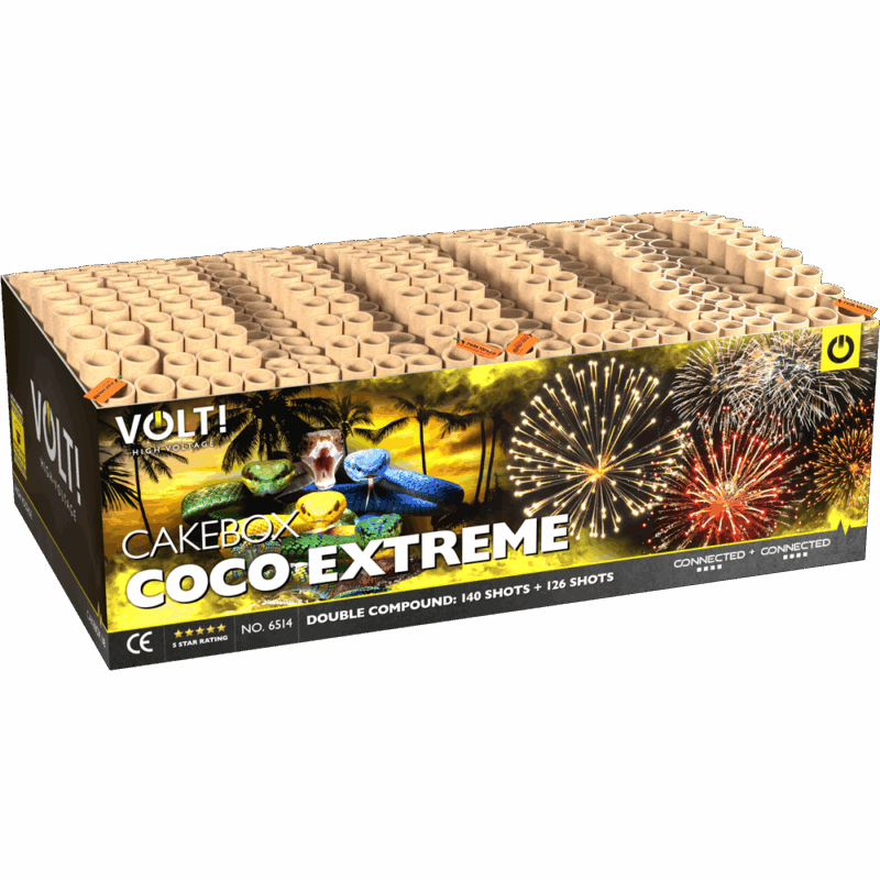 Alsof je naar de eindshow van een festival zit te kijken, blaast deze Extreme Showbox je volledig ondersteboven..! Dit is waar alles samenkomt; zeer diverse effecten, waaiers, kleuren en knallen overrompelen je zintuigen. 266 schoten, totaal bijna 2×2 kg kruit uit 30mm tubes laten je met kippenvel over heel je ruggengraat achter. Een dubbele compound voor dubbel genieten!