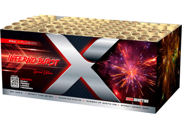 Rode strobe, titanium gold tails en felle neon effecten wisselen elkaar razendsnel af. Inferno Burst bouwt op naar een vurige climax en houdt de aandacht vast tot het laatste schot. Uniek in z’n tempo. Onmiskenbaar in z’n stijl.